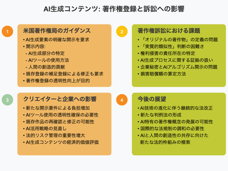 この開示要件は、著作権登録の透明性を高め、AI生成コンテンツに関する法的不確実性を減少させることを目的としています。しかし、同時に、クリエイターやコンテンツ制作企業にとっては新たな負担となる可能性もあります。
