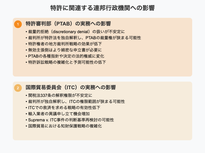 - 特許権者にとっては、ITCの判断が裁判所で覆される可能性が高まるため、ITCでの救済を求める戦略の有効性が低下する可能性があります。