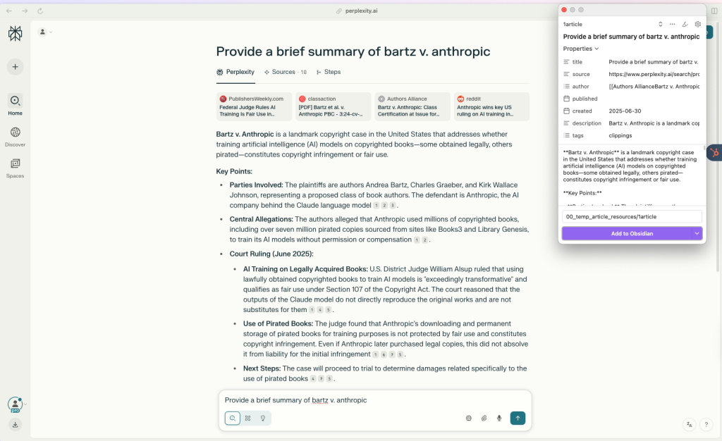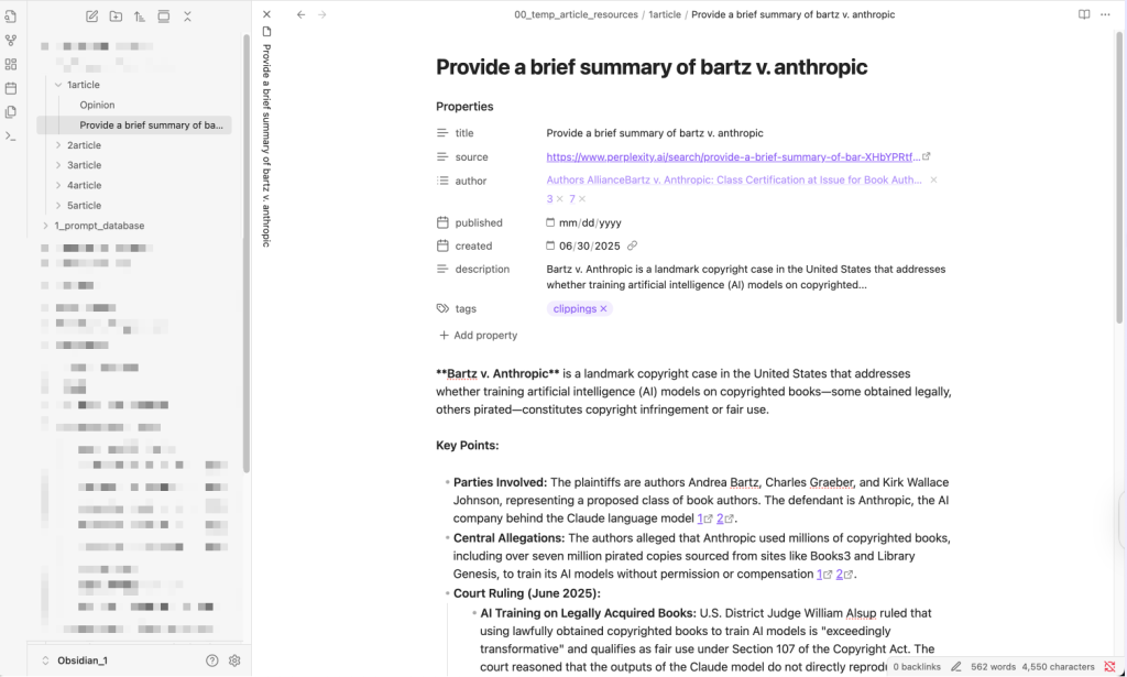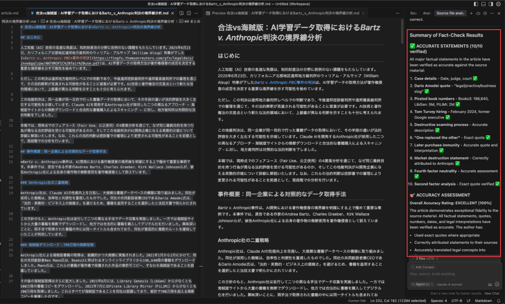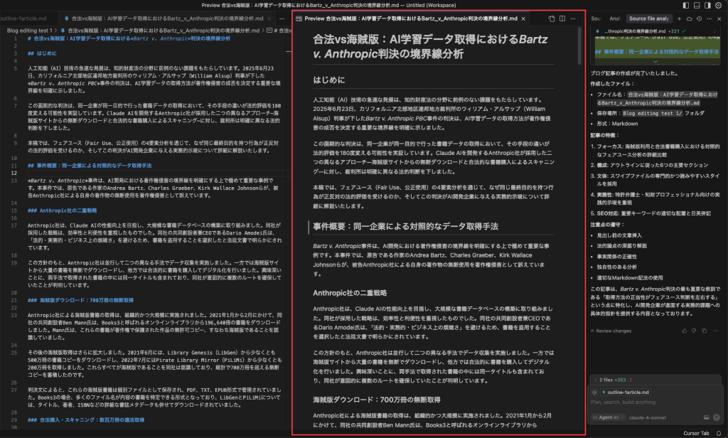 理論や方法だけ話すのは具体性が欠けるので、今回の解説記事では、最近注目されているAI著作権訴訟であるBartz v. Anthropicの地裁判決を解説する記事の作成過程の一部を実例として紹介しながら記事の作成フローを説明していきます。