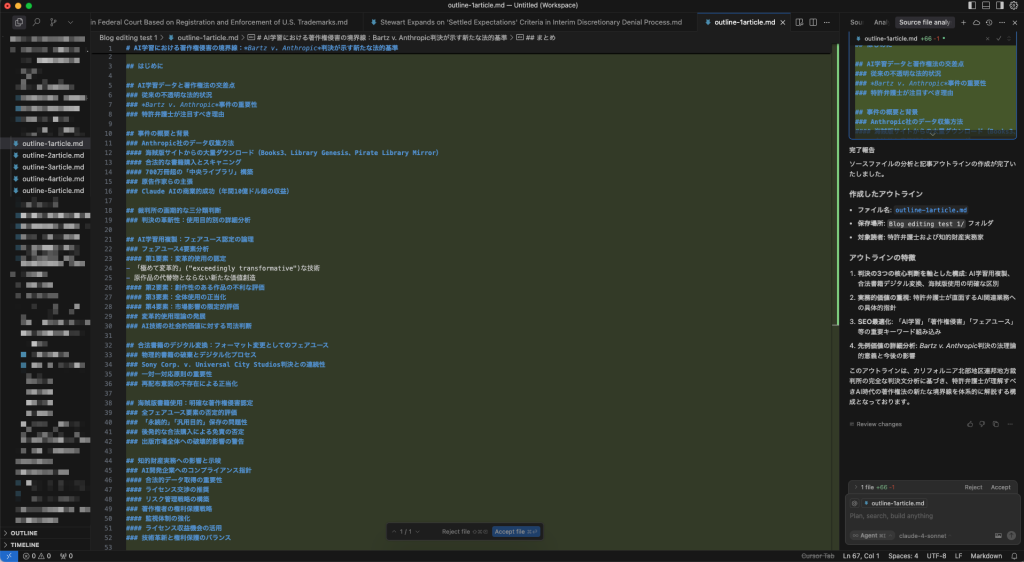 アウトライン作成では、情報の階層化と優先順位付けを行い、記事の論点を明確にします。例えば、生成AIが判例全体の解説のような内容を作成した場合、記事のポイントが分かりづらかったり、記事が無駄に長文化する傾向があります。そこで、そのような場合、注目する論点に絞り、関連性の低い部分は削除してよりコンパクトな構成を作成するようなプロンプトを指示します。これは使用するLLMのモデルによって異なると思いますが、最近のclaude-4-sonnetは詳細なアウトラインを生成することが多く、それによって最終成果物である記事が長くなりすぎることもあります。そのため、制作過程で調整できる部分は積極的に調整し、記事作成後の負担を軽減するよう心がけています。