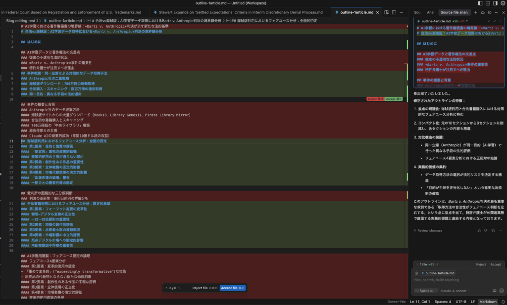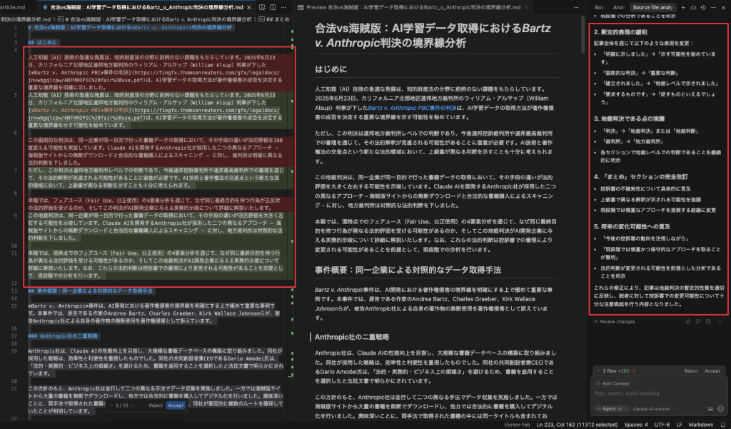具体的な内容は取り上げる判例や記事で伝えたいポイントなどで変わってきますが、例えば、今回のAnthropicの判決文における記事の場合、地裁の判決にもかかわらず断定的な表現が気になったので、今後控訴される可能性も考慮して、判決の変更可能性を示唆する内容に全体的に補正を加えます。