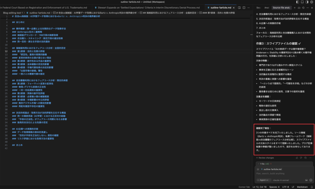 まずPerplexityで概要を理解し、その後必ず判決文の原文を入手します。Perplexityによるまとめは理解の出発点として有用ですが、最終的な記事作成では必ず判決文の原文をメインのソースとして、これらをマークダウン形式で保存します。この段階での情報整理が、後の記事作成プロセスの効率性を大きく左右するため、十分な時間をかけて行います。