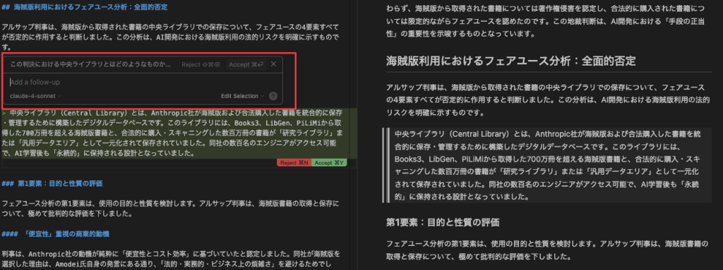 今回事例として取り上げたAnthropicのAI著作権訴訟の解説記事でも、最初のアウトラインは判決文全体の解説になっていたので、海賊版の利用と法的な書籍購入におけるフェアユースの分析の違いに注目したアウトランにしてもらうようにプロンプトで再度指示をしました。
