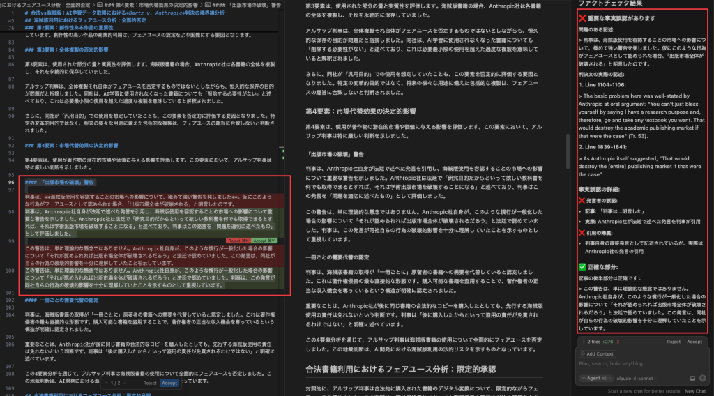 これはCursorの仕様に関する細かな話になるのですが、ピンポイントで補正・追記する場合は、本文で直接LLMを呼び出しますが、記事の広範囲における補正や事実確認などの場合は、右のチャット欄からプロンプトで指示するなどの使い分けをしています。