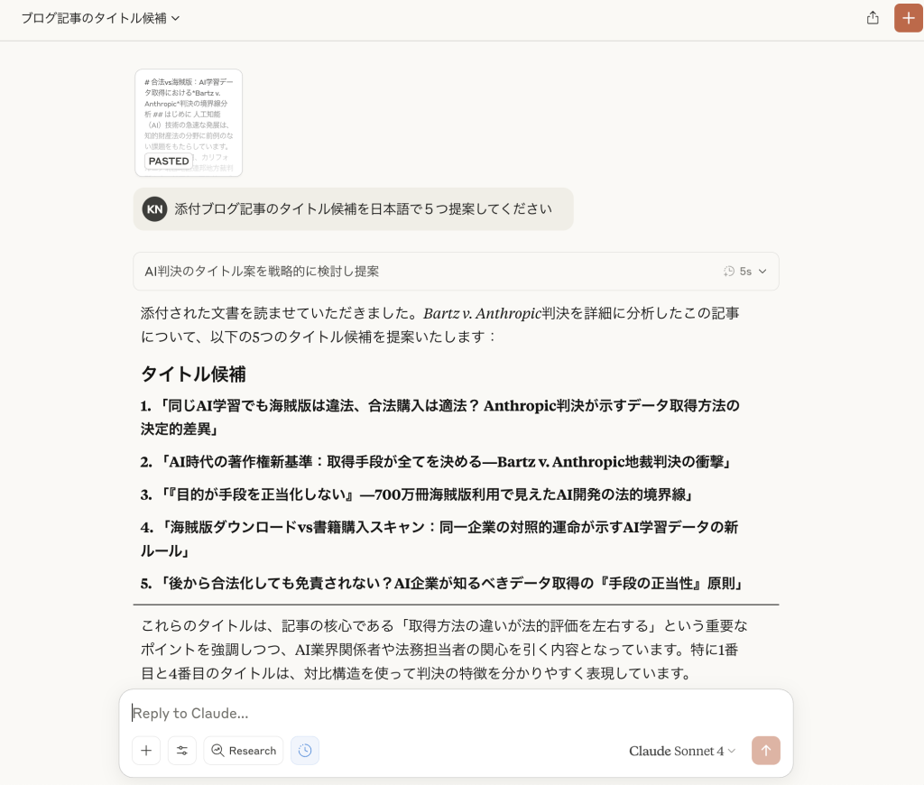 この時点で現在のタイトルに満足できない場合は、チャット履歴なしで記事の内容だけから適切なタイトル候補を提案してもらいます。別のツール(Claude等)を使用することで、より客観的な視点からのタイトル提案を得ることができます。