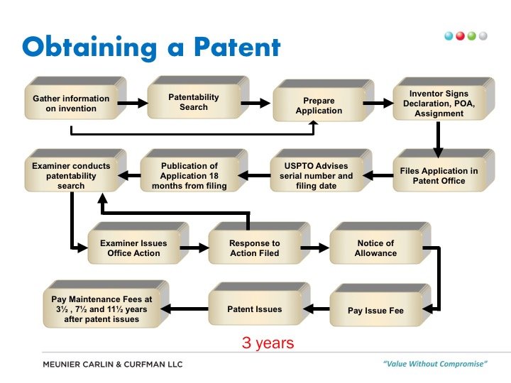 出願から特許の交付まで平均3年かかる。