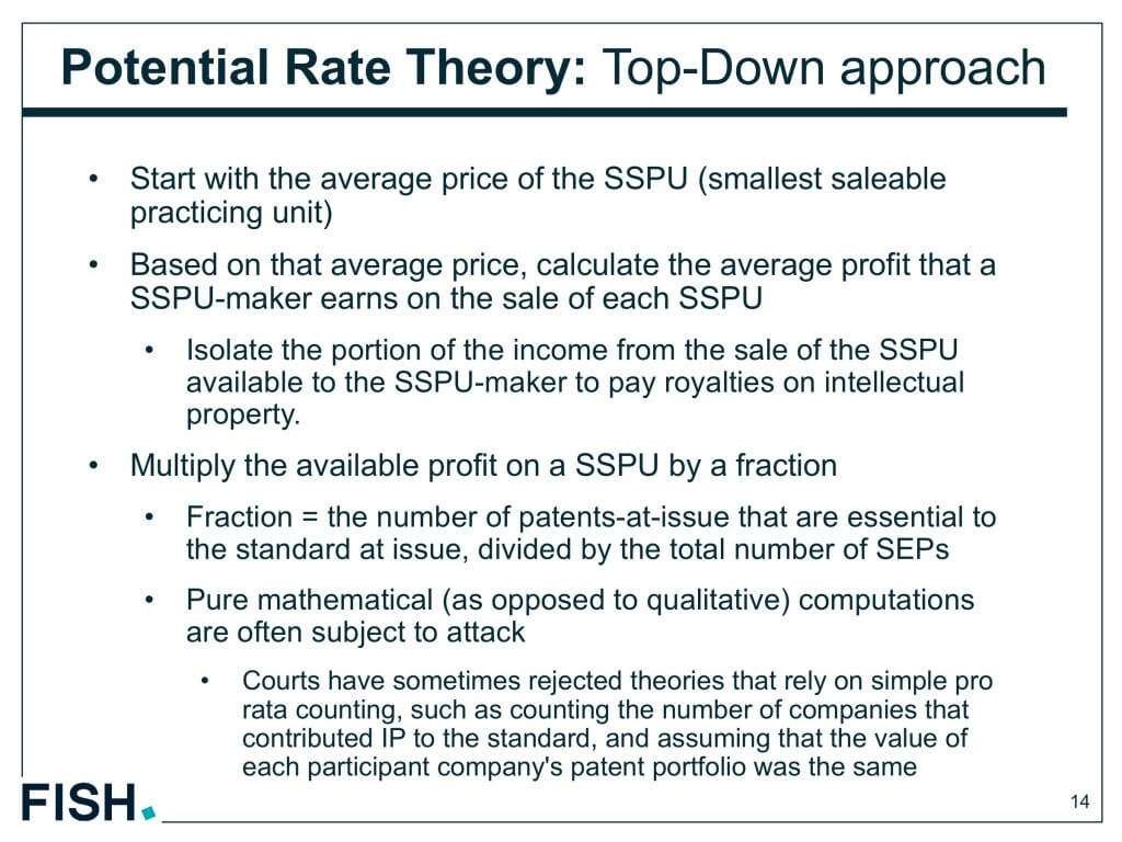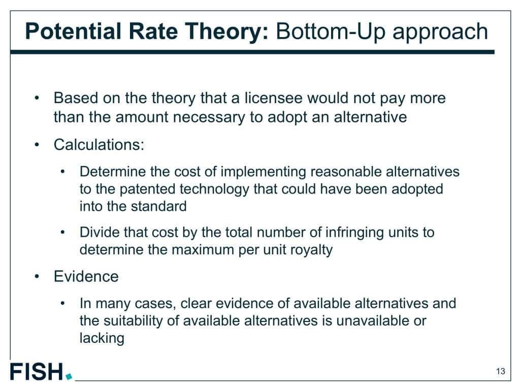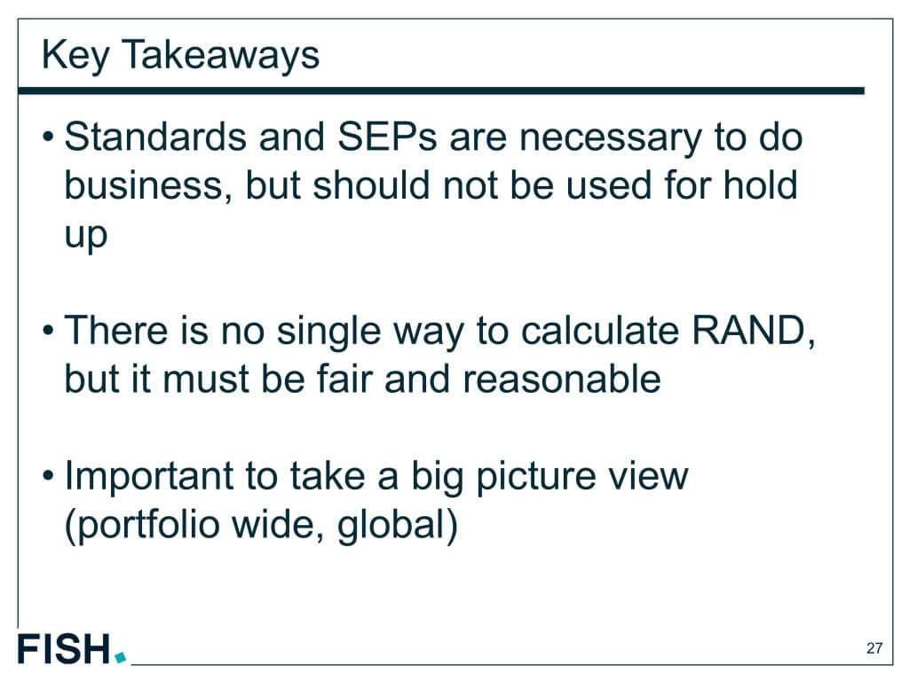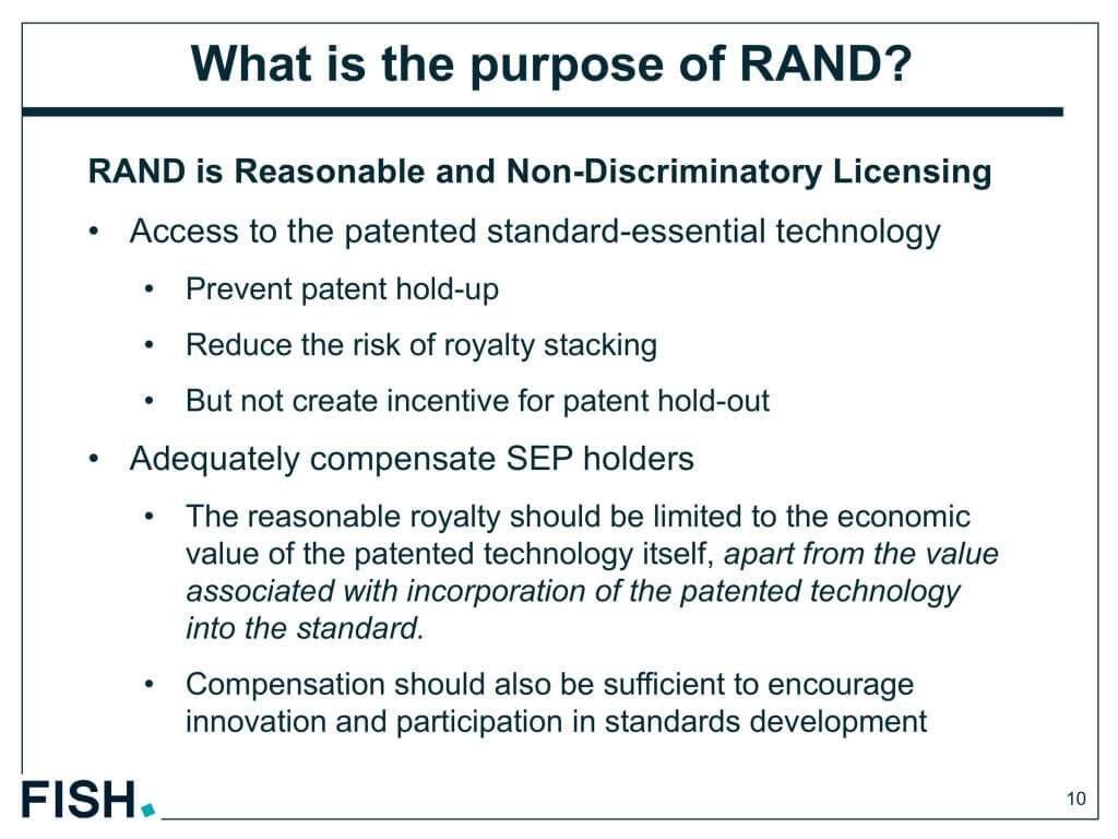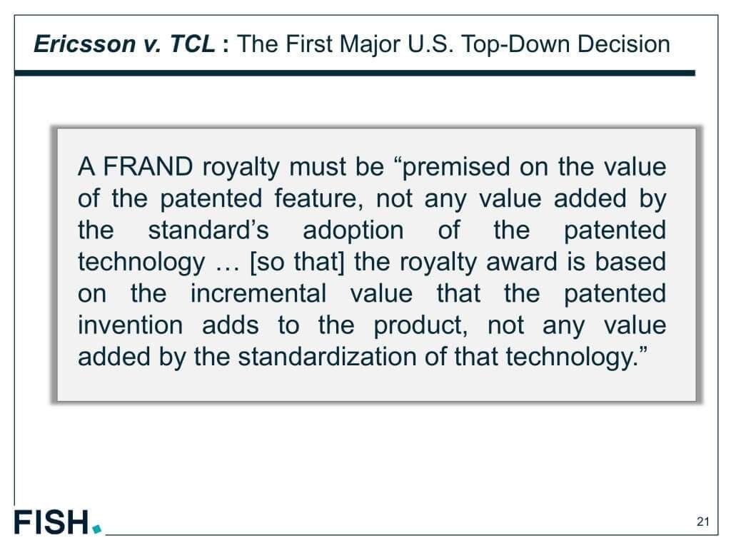 FRANDロイヤルティーは、特許で守られている特徴に対する価値にとどまるべきであり、特許で守られた技術が規格に採用された際の経済的な価値は考慮されるべきではない。つまり、ロイヤルティーは、製品に加えられた特許技術の上乗せ価値がベースになるべきであり、規格に採用された際の追加的な価値は考慮されるべきではない。