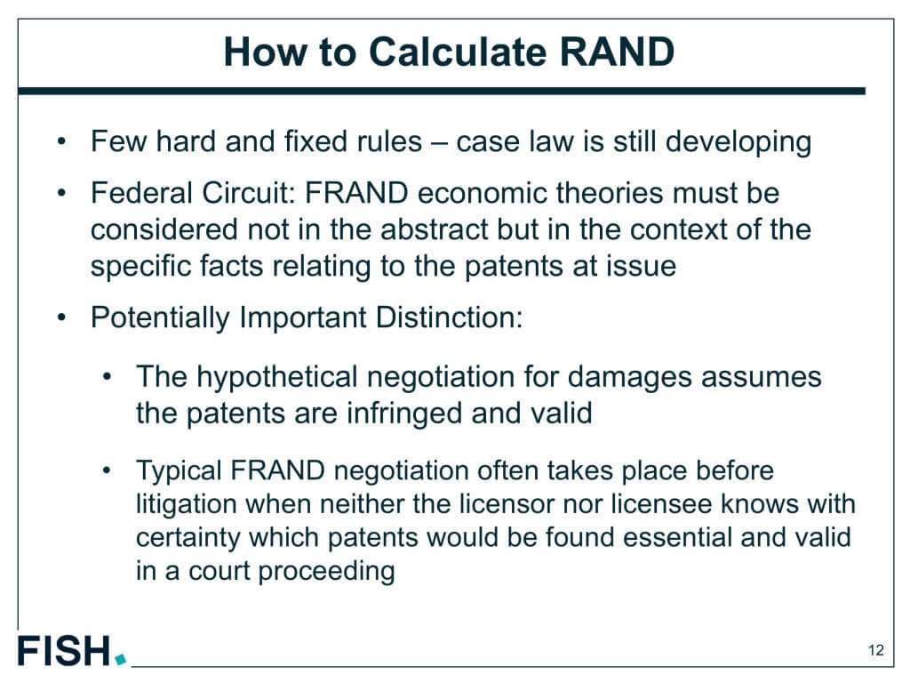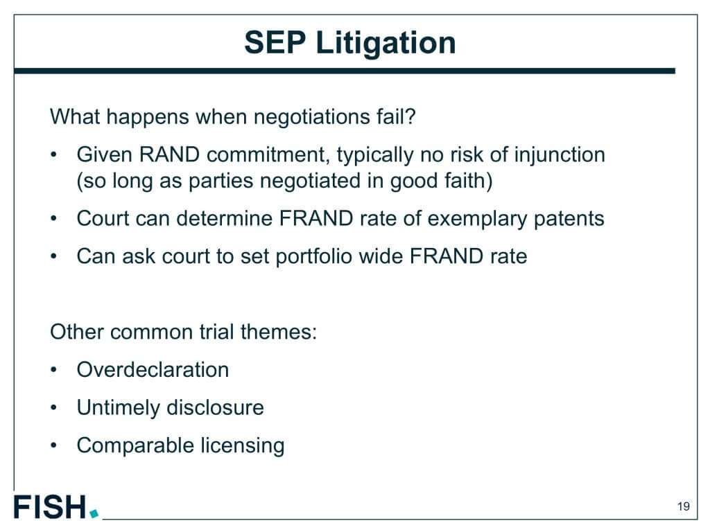 多くのFRAND交渉は訴訟以前に行われるものなので、裁判においてどの特許が必須特許で、有効と判断されるかわからないまま交渉の場につかなければならない。