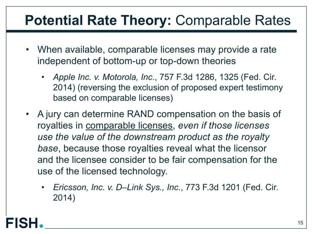 RAND補償が比較可能なライセンスのロイヤルティーをベースにして計算されることがある。その比較対象のライセンスにどのような計算方法が使われたとしても、結果として、その対象ライセンスにおいて、ライセンサーとライセンシーの同意が得られたという事実から、比較対象のロイヤルティーをベースにしてRAND補償が計算されてもいいという考え方。
