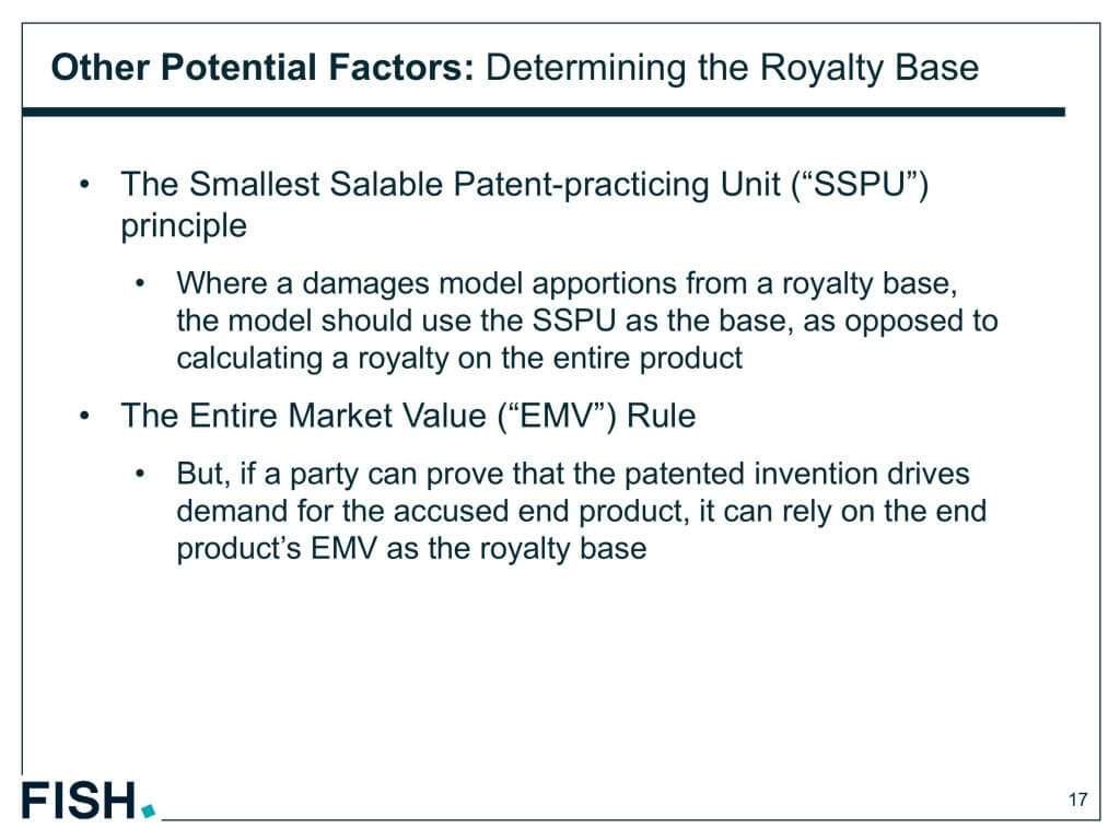 SSPUの問題。なにがSSPU(smallest saleable practicing unit 特許を使用している最小販売可能商品)なのかということ。ロイヤルティーの計算は、対象商品の全体からでなく、SSPUからロイヤルティーを計算するべき。