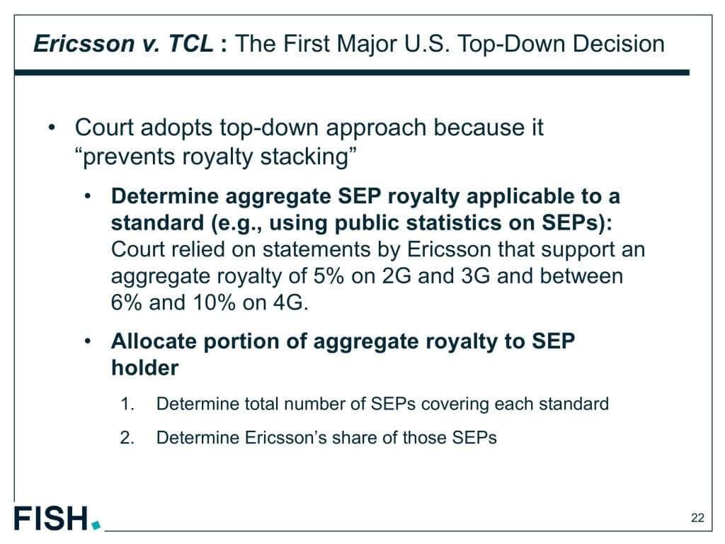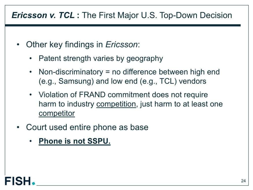 訴訟は、中国メーカのTCL社の携帯電話の売り上げとEricsson社の2G,3G,4Gに関する特許に関わるものでした。