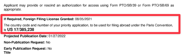 審査の結果、出願された技術が国家安全保障に影響を与えないと判断された場合、USPTOは外国出願ライセンスを付与します。このライセンスは、出願人が外国での特許出願を行うことを許可するものです。通常、外国出願ライセンスは、上記のようにUSPTO出願の受領通知に記載されます。